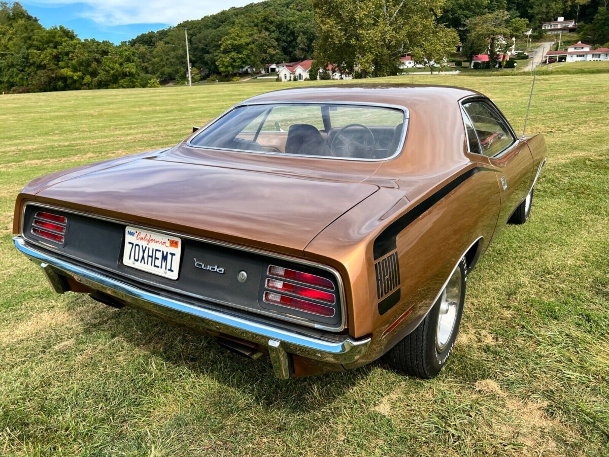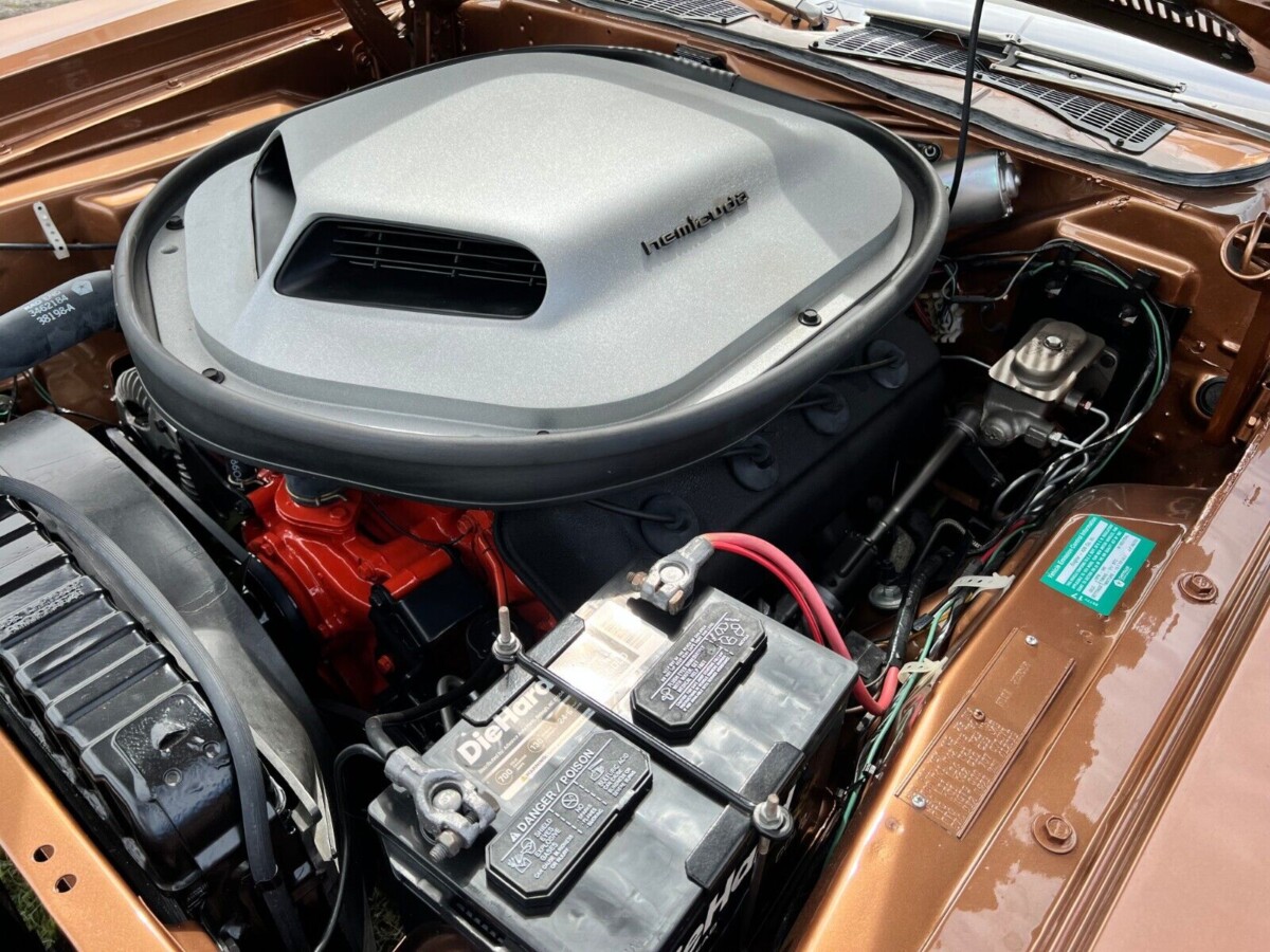 The original owner complemented the exterior Burnt Tan Metallic paint by ordering the car trimmed in Tan vinyl. It features a center console with woodgrain highlights, a slap-stick shifter, Rallye gauges with a factory tachometer, a Music Master AM radio, and power windows. The seller indicates that only ten buyers ordered their 1970 Hemi ‘Cuda with power windows, raising the rarity of this classic. The interior looks excellent, with no evidence of wear or abuse on any upholstered surfaces. The back seat is spotless, and I doubt it has ever seen use. There are no aftermarket additions, and the seller says that everything works as it should.