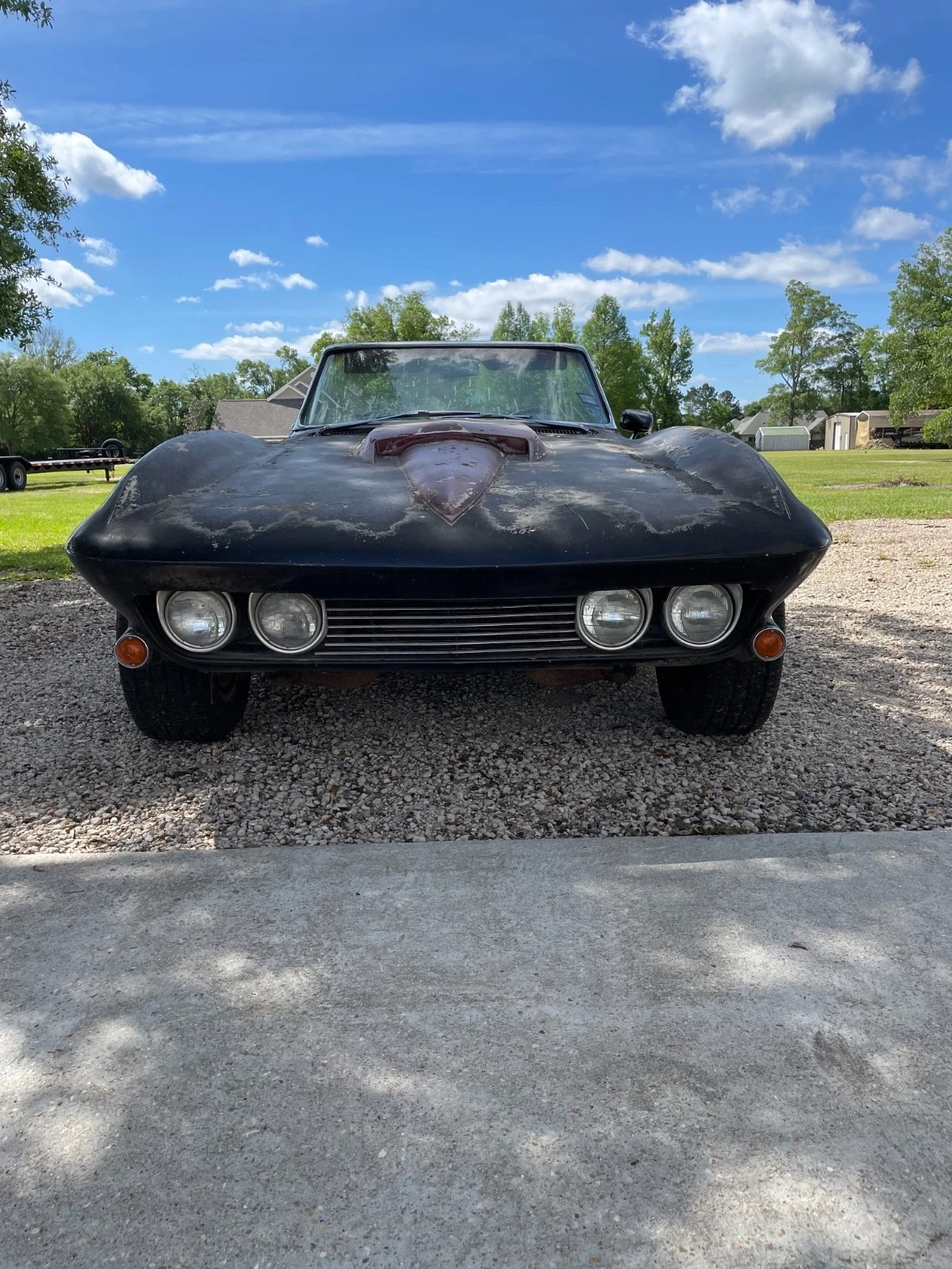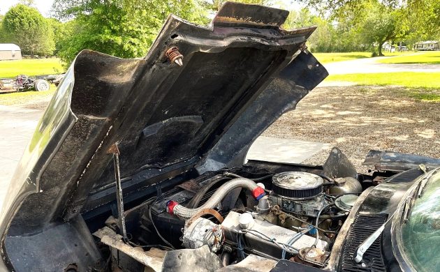 Black is confirmed to be the original color, and although the paint shows some fading and patina on the top areas, the fiberglass appears to be in reasonably good condition overall. Another custom touch is the aftermarket wheels, with bigs in back and littles up front, which work quite well with the other mods. The headlights have also been relocated, and I’m sure this one was once a fine-looking sports car. It’ll be up to the buyer to decide whether to restore this C2 to factory specs or stick with the Day Two appearance.