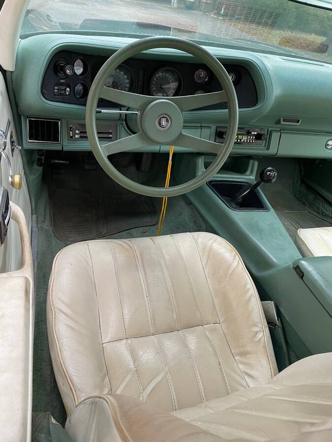 The interior is green with white seats and door panels. The seats appear to be soiled or turning brown with age. The listing states that the car has been garaged. The ad states that the car starts and runs smoothly. There is no mention on the age of the whitewall tires but the seller suggests trailering the car home. The listing also states that only 15,000 Camaros were built in this color in 1978. The car does not have a lot of options but does have an aftermarket AM/FM cassette radio.