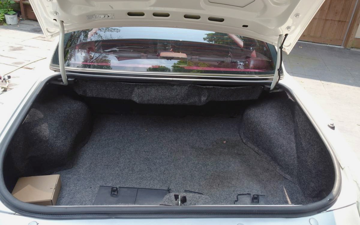 This car has never been in an accident, according to the seller, and I don’t see a flaw on the exterior at all, do you? The interior is showing some of those 144,000 miles in some heavy wrinkles in the deep red leather seating surfaces in front, along with the steering wheel cover. Maybe that’s just a comfort touch rather than hiding any fading or cracking. The trunk compartment looks like new, other than some dirt or a light stain on the right side of the carpet.