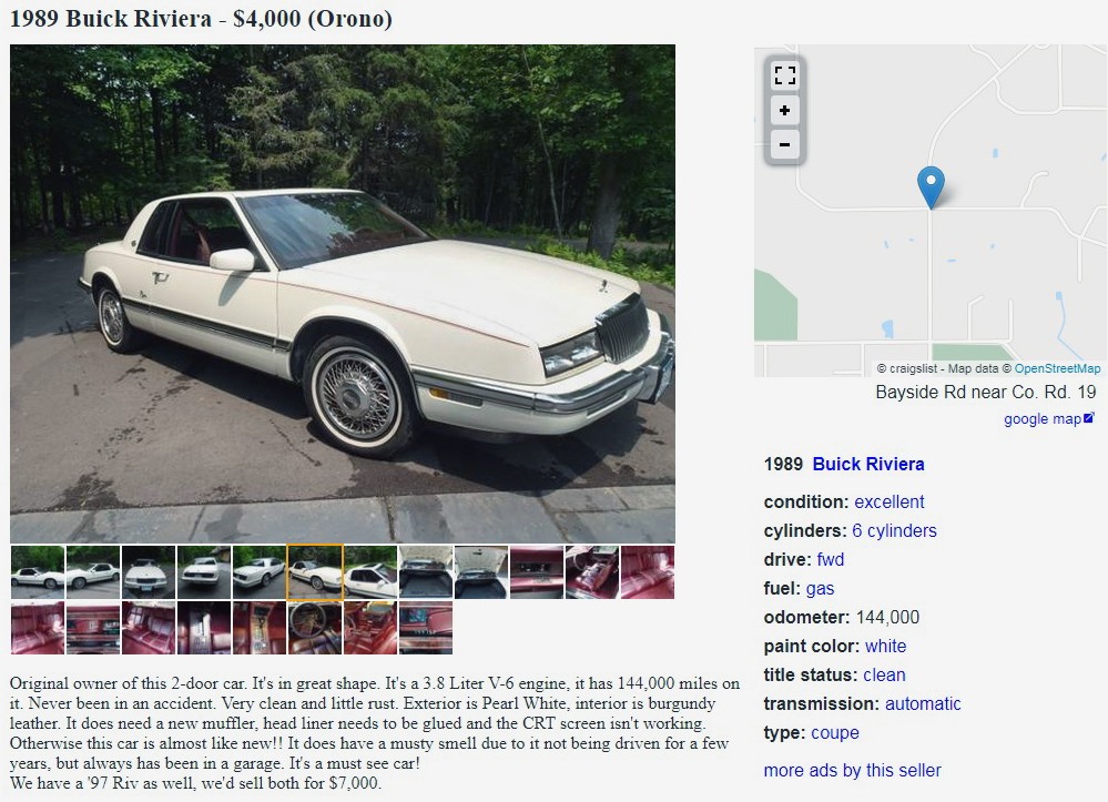 The seller claims to have a ’97 Riv that they will throw into the deal for an extra 3K. I would like to see that one – it may be worth the 3K by itself.