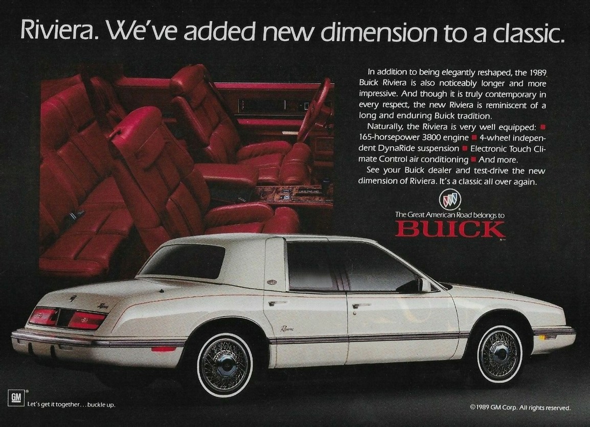 The 1989 Riviera Graphic Control Center is pretty much not shown in the provided photos. It is the touch screen affair in the center of the dashboard for things such as temperature settings and radio/sound, which pretty much necessitated taking eyes off the road to change things. Badged High Tech at the time, GM apparently thought it would be GEE WHIZZ! Instead, unless one had a passenger to be the co-pilot, it meant pulling off to the side of the road to make adjustments.