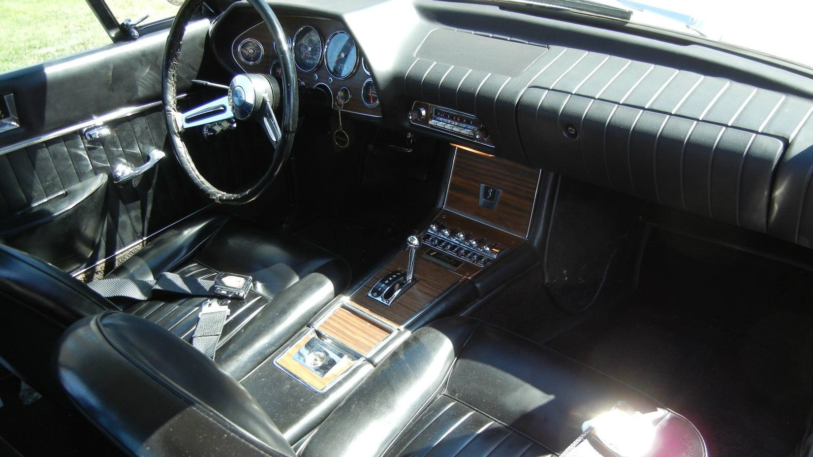 The seller replaced the original interior dash and console with wood grain. As you can see, this car was fitted with the three-speed automatic transmission. Notice the styling of the dash — very European influenced.