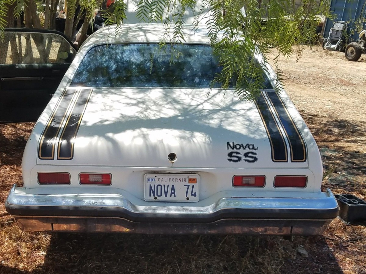 In ’74 the government was putting pressure on the automakers not only for emissions but for safety as well. Low-speed impact absorbing bumpers were required which added length and made for design challenges. One interesting feature of the ’74 Nova was a switch under the driver’s seat that prevented the car from starting unless the seatbelt was buckled, I’m sure this resulted in some unnecessary tow-ins. From the limited pictures, this Nova seems to be in nice original condition aside from the missing trunk lock. The stripes and huge SS decals on the trunk and fenders look like a custom add-on, but that is the way it came from the factory.