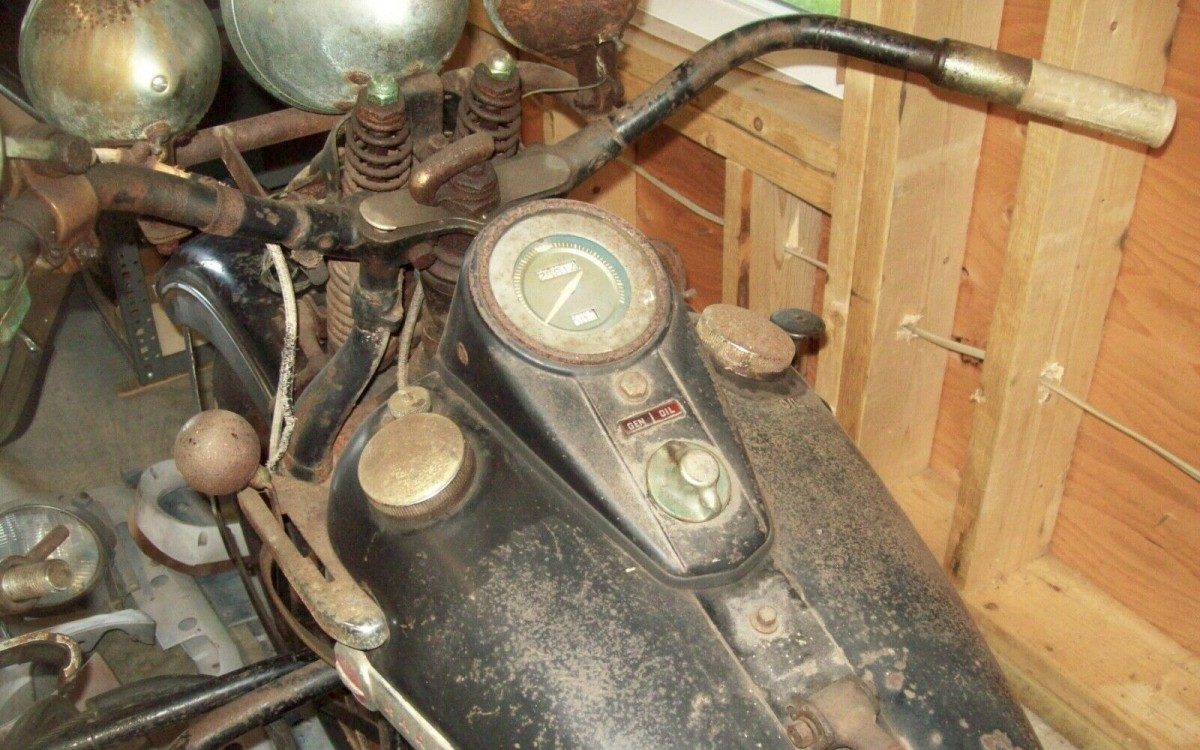 I’m not sure where it was stored, but I’m guessing it was somewhere that the bike was exposed to some elements. The seller says “The original exhaust, tires, and saddlebags rotted off the bike…kickstand and battery box were also replaced…from sitting in the dirt for 50 years.” Thankfully the ad says that they have all the original parts except for the chain guard.