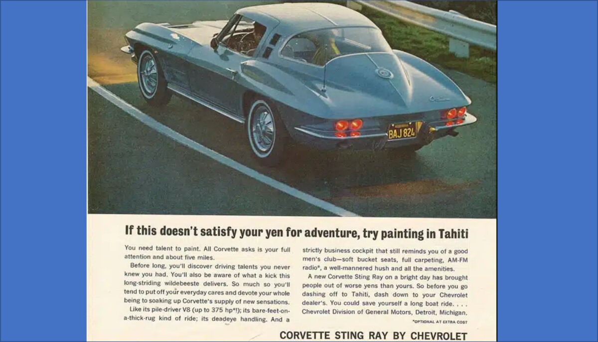 I wanted to refresh my memory of what image GM was trying to push with period Corvette ads. Most looked like this, with the car being characterized as a “long-striding wildebeeste” (sic) and having a “cockpit” that reminds one of a “men’s club”. On the other hand, others were portraying the car as having a dual personality, with elegance and luxury along with the sports car vibe. For those of you that have driven a C2 (shorthand for the 1963-67 cars), what do you think of the driving experience?