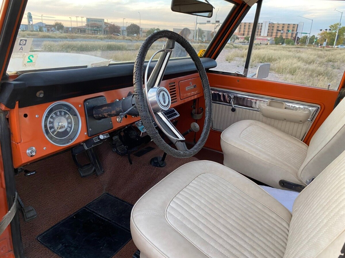One area requiring no attention is this Bronco’s interior. The seller recently installed new seatcovers and door trims, while the dash, pad, and mat look excellent. The painted surfaces have a few marks, but these don’t detract from the presentable state. It also appears largely unmolested. The seller has avoided the temptation of a floor-shift conversion, and the factory AM radio retains its rightful place in the dash. There is a dealer-installed A/C unit mounted under the dash, but the lack of a compressor drive belt suggests there may be a system fault requiring investigation.