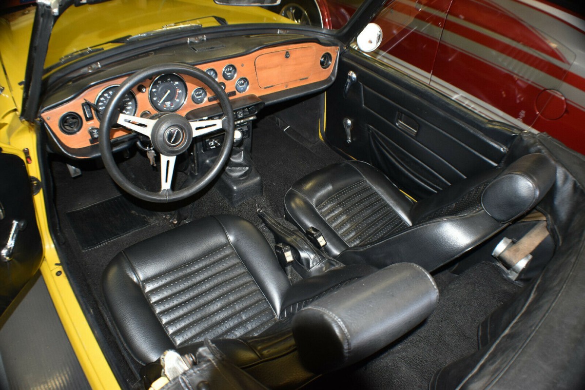 There’s more to like with this TR6 when we turn our attention to its interior. Upholstered in Black, it presents beautifully. There is no visible wear on the seats, while the remaining trim is excellent. The carpet exhibits no evidence of wear, the markings on the gauges are crisp and clean, and the lenses are clear. The timber veneer dash looks pretty nice, although a crack and some lifting are visible on the glove compartment door. The owner has installed an AM/FM radio/CD player in place of the original radio, with flush-mounted speakers in the kick panels and box speakers mounted behind the seats. Otherwise, this interior is original and unmolested. It looks like a pleasant place to spend some time while the miles roll effortlessly under the wheels.