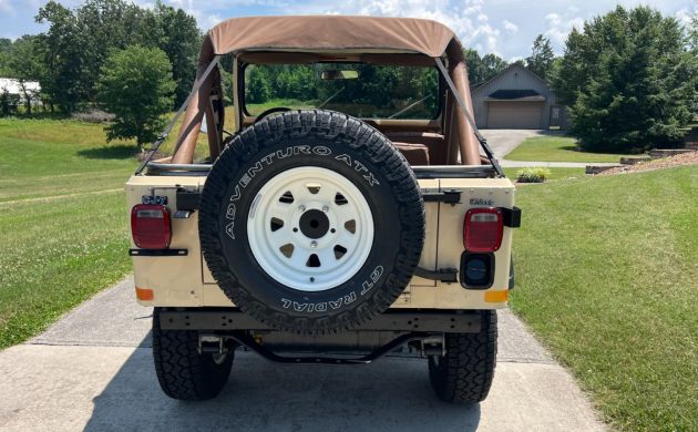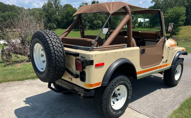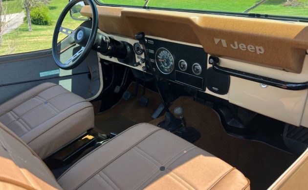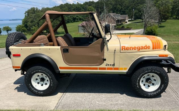 You don’t often find a CJ7 this well-preserved, and even rarer in original paint and decals. This 1979 Jeep CJ7 Renegade is finished in Morocco Buff and still wears its factory striping and trim. Power comes from the original 304 cubic inch V8 paired with a 3-speed manual transmission, and with just over 71,000 miles showing, it’s a Southern survivor that hasn’t seen the abuse or corrosion that plagues many classic Jeeps. The seller notes that it retains its original wheels, now wrapped in a fresh set of five 31×10.50 tires. See it here on eBay with a clean title and what looks like a well-preserved body and undercarriage.