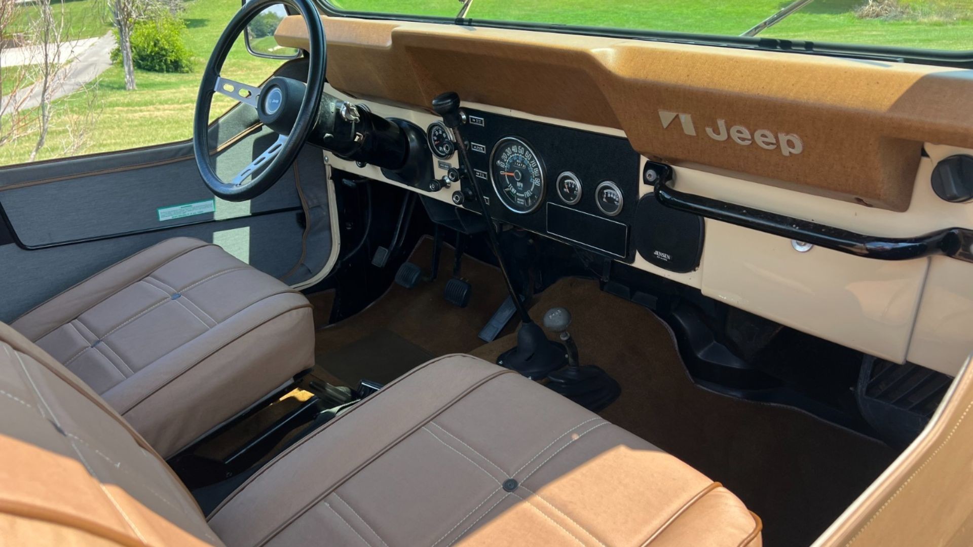 The seller points out several rare and desirable options on this example, including power steering, power brakes, tilt steering column, factory tachometer, and factory clock. These kinds of comfort features were less common on utilitarian Jeeps of this era, but they add considerable usability, especially if you plan to drive and enjoy it on a regular basis. Inside, the brown denim seats with buttons are said to be original as well, and they complement the exterior finish nicely. The hardtop is not mentioned, so it appears this one is being sold as a soft-top or open-air example, though pictures may show otherwise.