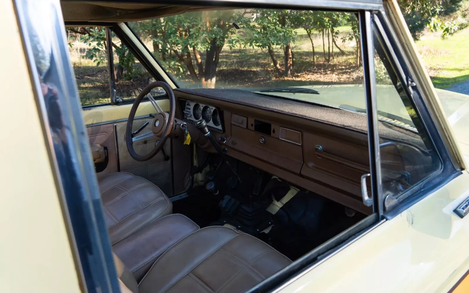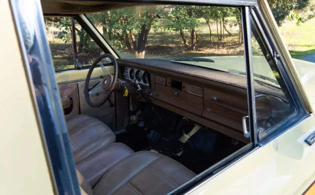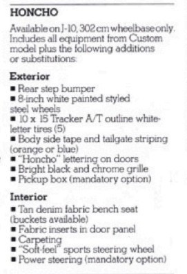 What is the Honcho, anyway? It’s simply an appearance package available on short-wheelbase J-10s, consisting of special wheels and big tires, blue or orange stripes, special upholstery, and a few other odds and ends. Our featured J-10 is painted “Saxon Yellow,” which is a stately name for a truck called “Honcho,” so the orange stripes were really your only option. With its big tires and four-wheel-drive, the J-10 does look like it’s ready to attack a lonely desert trail somewhere. Few interior colors were available; this one is simply titled “beige.” Truth in advertising it is, “mucho macho” it is not. You might be able to tell by the waist-high shifter, but this truck has the standard four-speed manual.