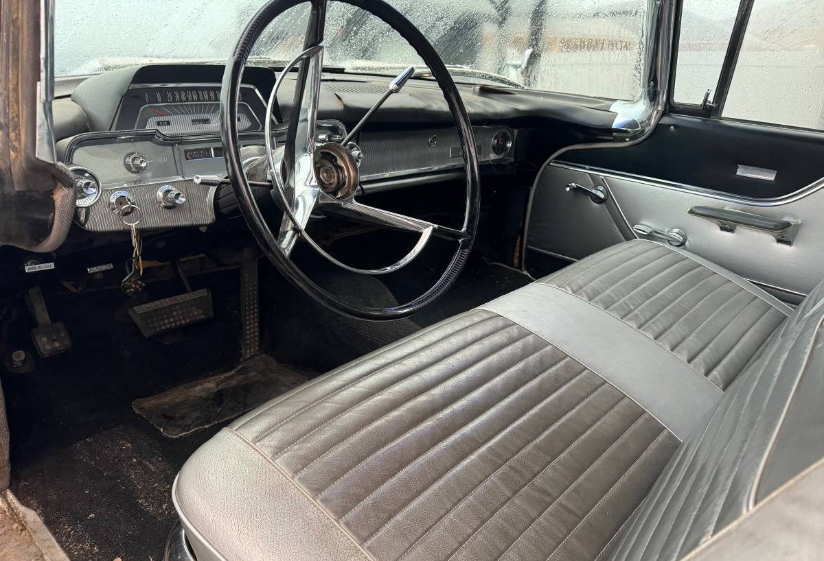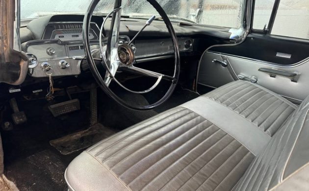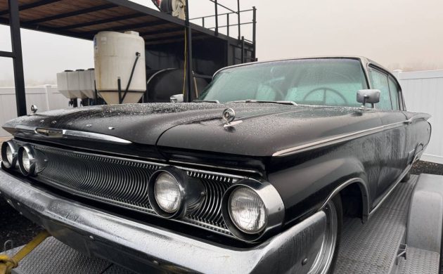 The 1960 Mercury sales brochure stated, “Styled for the discerning buyers, the 1960 Mercury steps years ahead of the crowd with Sleek-Line styling, passenger-planned comfort, and exclusive Road-Tuned ride.” Styling cues, such as the narrow concave grille and wide headlight spacing, helped to visually give the Merc a long, wide, low-slung look. And notice the huge “Panoramic Skylight” windshield which was Mercury’s largest ever at the time. The enormous wraparound back glass and slanted C-Pillar also gives the car a look of motion. It also makes for quite the greenhouse effect in the Merc’s comfortable cabin. The car’s original Tuxedo Black paint is said to be original and looks presentable based on the photos. The chrome bumpers, glass, and Park Lane trim look good as well and appears to all be there.
