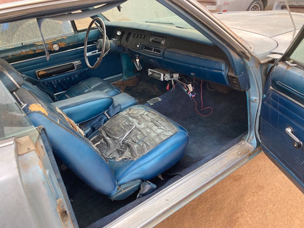 The medium blue interior shows the Charger is equipped with a bench seat that has been repaired with duct tape and the transmission is shifted via a column shifter. There appears to be an aftermarket radio or a track player founded under the dash. The door panels are well worn and the seats has tears and foam exposed. The carpet actually looks pretty good. The back seats are dirty but look like they have not been sat in very often and just have fading from sun exposure.