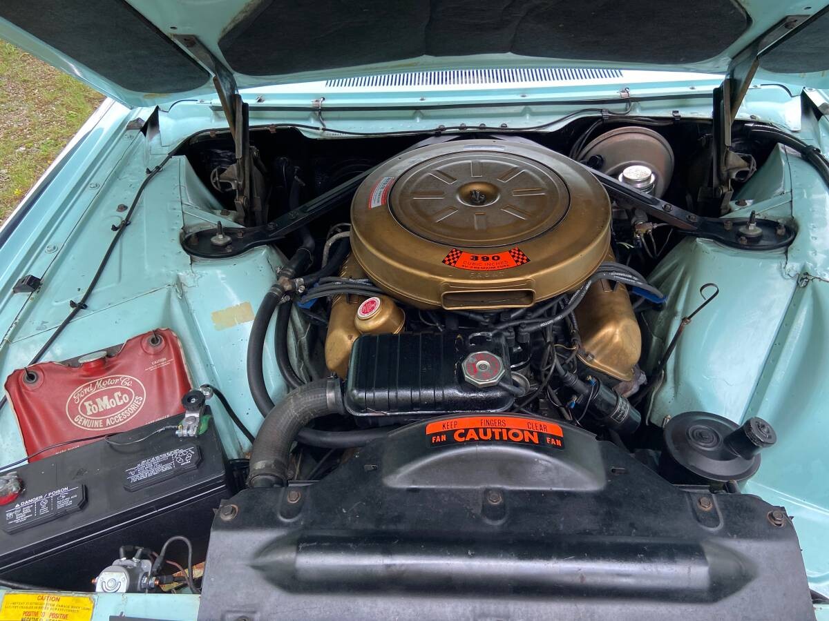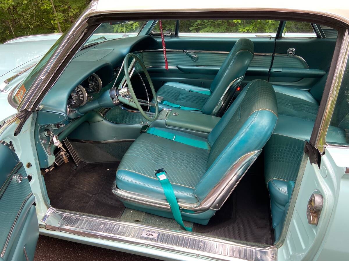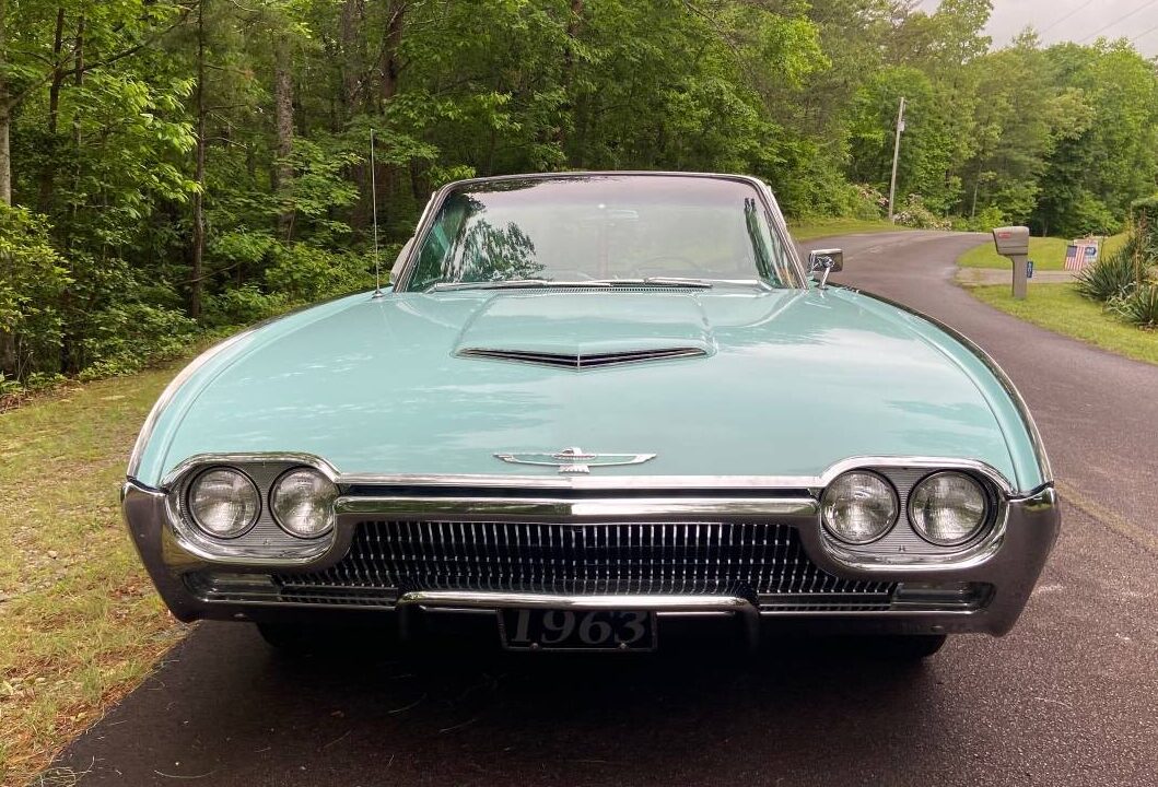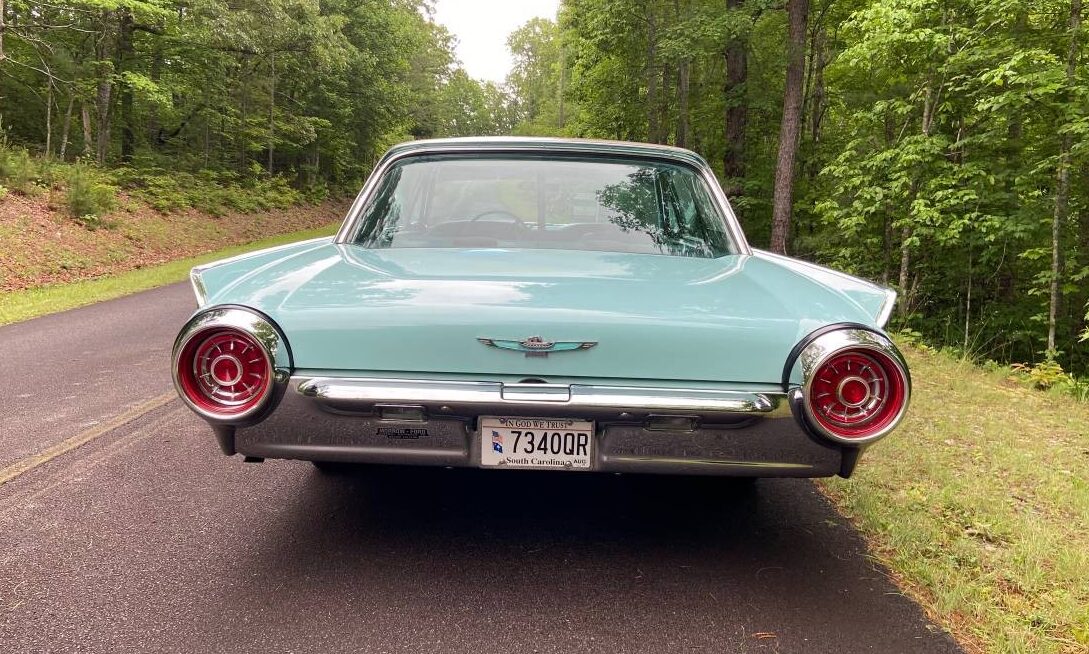 The seller doesn’t share a lot of history or how long he/she has owned it after purchasing the T-Bird from the original owner. It’s being sold because the seller says “We are downsizing our home and some of my vehicles must go (no room at the new home).” Based on the photos, the car is in exceptional condition for a 60-year-old vehicle. There is no rust and the original Chalfonte Blue and Corinthian White paint looks very presentable. (I can’t recall seeing many ’63 Birds in this shade of turquoise, but it’s a beautiful color.) The chrome, trim, badging, and glass all look very good as well as the spinner wheel covers. The ‘Bird has Coker tires and although the whitewall width is a little bit wider than the ‘Birds you see in 1963 advertising, they still look good and compliment the stylish white top.