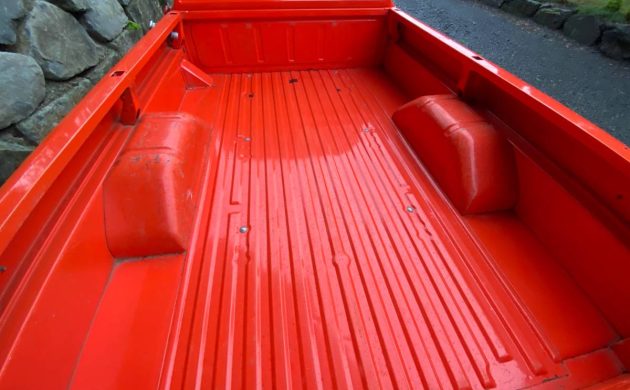 The eight-foot bed may or may not be a selling point, but its immaculate condition sure is. You may have noticed in the picture of the truck’s passenger side that it has the optional “tool box with door lock” behind the passenger door for extra hidden storage, a neat option. This image of the bed also highlights the color, which appears to be “Calypso Coral,” something you might expect to find on a Mustang Mach 1 rather than an upscale pickup.