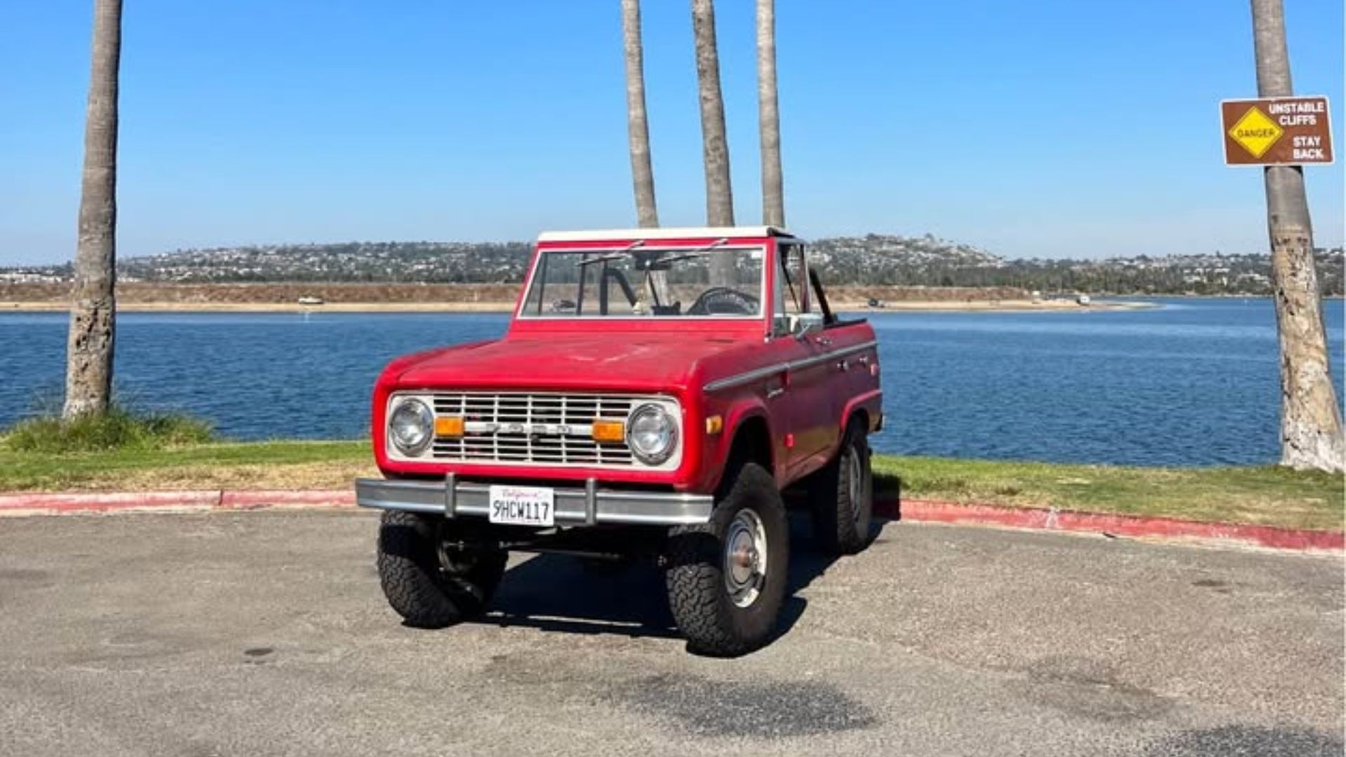 Finished in red with a white interior, the Bronco is said to have zero rust—an increasingly rare claim for any early Bronco, especially one wearing its original sheet metal. The body remains uncut, preserving the classic fender lines and factory trim. The paint is worn but original, and the aged patina tells the story of five decades on the road—or perhaps parked under the desert sun. The seller proudly notes the originality carries through to the drivetrain and interior, including the sliding bench seat, factory radio, manual transfer case, and even the rare factory air conditioning system.
