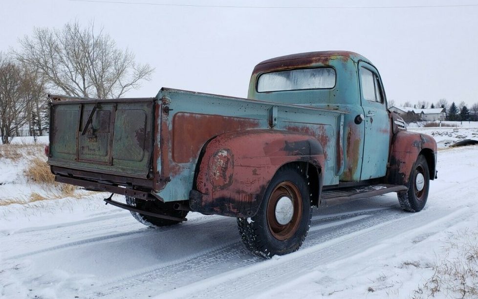 Another Sweetgrass special. Looks like another good unit to snap up. Lots of work to do but you could see if you could get this running and actually use it as a truck while you fix it up. Engine looks like either a period Ford Rebuilt or it could’ve been yanked out of a ’52-’53 passenger car. Both engines were orange while the original truck engine would’ve been red. Starting around ’52 this model started to fade away from the Sweetgrass region as the farms grew and the tonners gave way to larger trucks. But I still like the tonners. I remember as a kid, a couple of these were actually used as a family car on Sundays. If it was summer you could put the bigger kids in the back but in the winter I saw the mom and dad and four kids all wedged into that small cab. Well, I’d better get onto something else because I’m liable to do something that my wife won’t approve of. That truck is just too close to home…