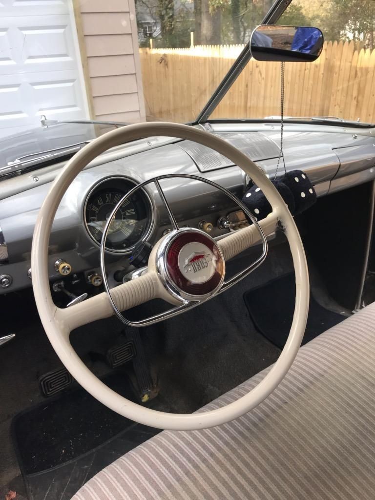 Look at that perfect steering wheel…this car is stunning. My father had a 1949 coupe in light green, seafoam green? I can barely recall that one as I was too young.