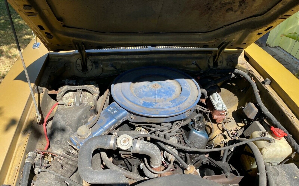 Poop brown? The color is GOLD, over Vanilla vinyl. I happen to think its a gorgeous color combo. Its also clearly been repainted on the left side. The peeling top means its been in the sunbelt, which means a lack of rust. I’d rather replace a vinyl top than a floor or quarter panel. Are these the best cars ever made? No. But they are a great looking little car, inside and out, and were right for the times when new.