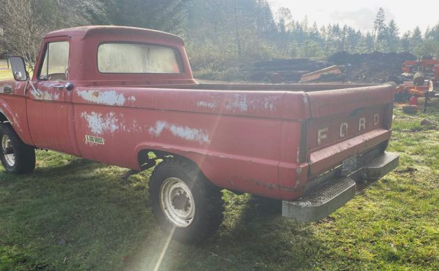 I’m probably one of the few living humans who wouldn’t put giant off-road tires on this truck. I would add a front bumper, but I think the wheels and tires are perfectly sized for this truck. It looks like the size that would have been on this truck when it was new, like something you’d see in a 1964 Ford brochure. Although, this one would have originally been in the rear-wheel drive section of the brochure, as it was converted to 4WD at some point.