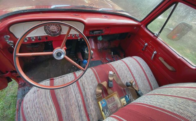 The fourth-generation F-Series was made from October 1960 for the 1961 model year until the end of 1966, and this Rangoon Red example has a healthy coating of surface rust. Is that an oxymoron? This truck would look sharp repainted red with new tires (which it needs) and those white rims, or wheels, as most people say these days. We grew up calling vehicle rims “rims.” The “wheel” was the whole assembly of tire and rim where I grew up, maybe it’s a regional thing. The interior looks pretty nice overall, even the blanket seat cover. You can see the four-speed manual and the transfer case (Dana? Spicer?) shift next to it with a blue knob.