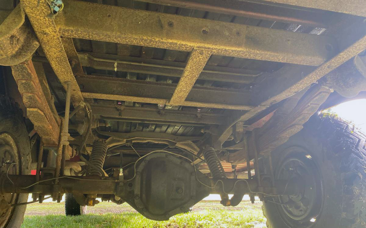 The seller doesn’t give any info on that at all, but they do show a couple of underside photos, and it looks solid, with just heavy surface rust underneath. The body on this fourth-generation F-250 looks solid all over, with maybe some rust starting in the seams, cracks, and crevices here and there. The bed floor looks solid, again with maybe some rust starting in the seams, and there’s a patch panel on the right side in the front of the bed, as you can see in the photo.