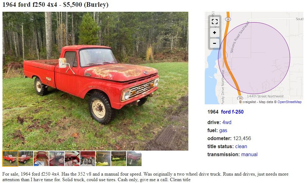 I know I’m way off on what I think is a good look for a vintage 4×4 pickup, as I think this 1964 Ford F-250 4×4 looks 100% perfect. At least stance-wise, height-wise, and wheel-size-wise. The seller has this former 2WD truck posted here on craigslist in Burley, Washington, and they’re asking $5,500. Here is the original listing, and thanks to Curvette for the tip!