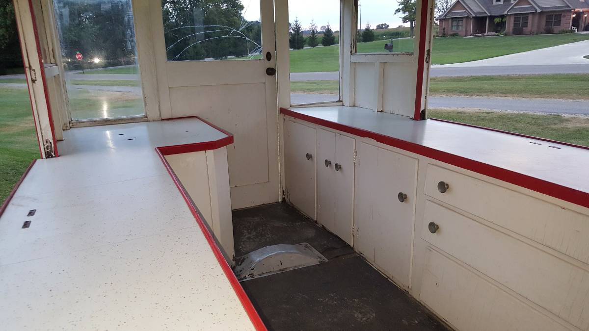 Back where the money is made, things are a bit more utilitarian. Plywood kitchen type cabinets and vintage formica make up the bulk of this area. Despite being a popcorn wagon, no popcorn popper is present. Perhaps it is in one of the cabinets, or it is waiting for you on Amazon.com. Before you begin, a lot of detail work will need to be completed, from repainting the cabinets to replacing the glass in the back door that appears to be freshly stolen from Aunt B’s house.