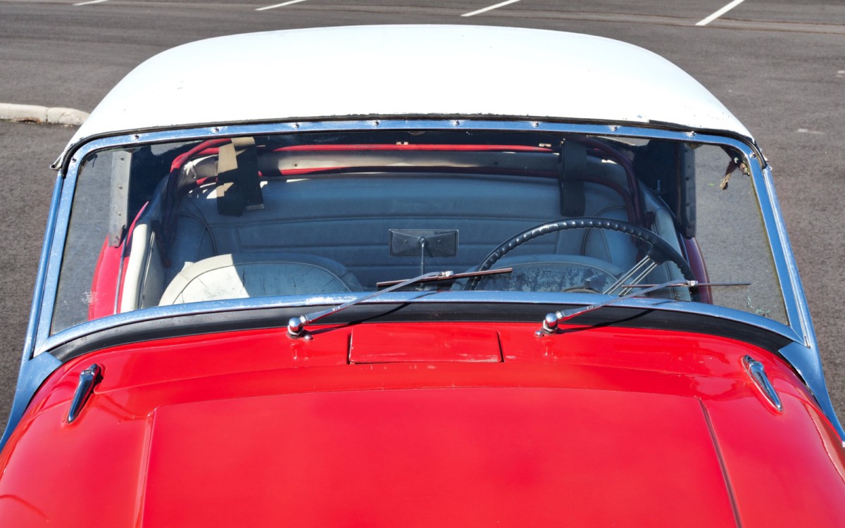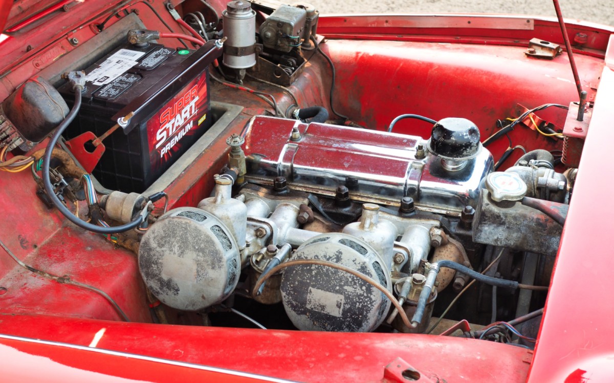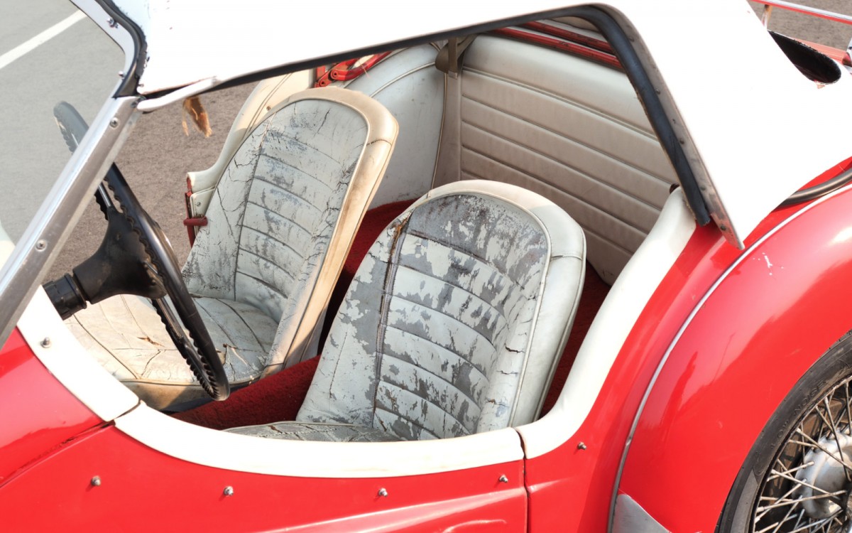 There are still things that need to be fixed to make this a very nice driver. The interior is probably the biggest project left, as it could really use new upholstery and carpets. Everything you need to finish it is readily available and fairly simple to install. The seats appear to be the originals but were dyed or painted white when the car was restored. The dash still wears its original grey covering, which looks great with the red paint, although with the white hardtop a white interior might look best.