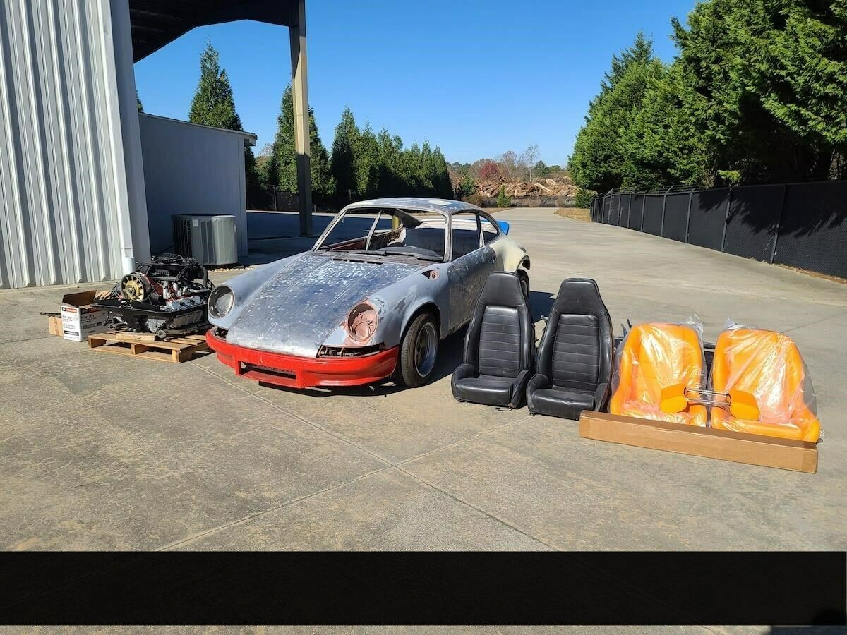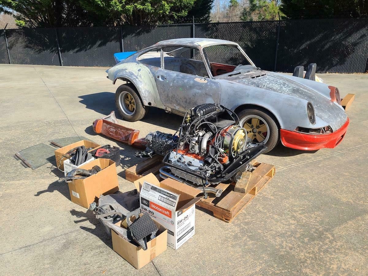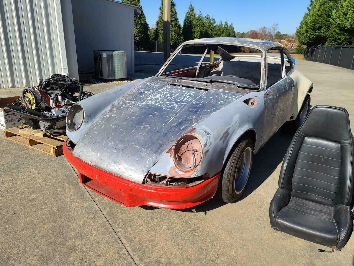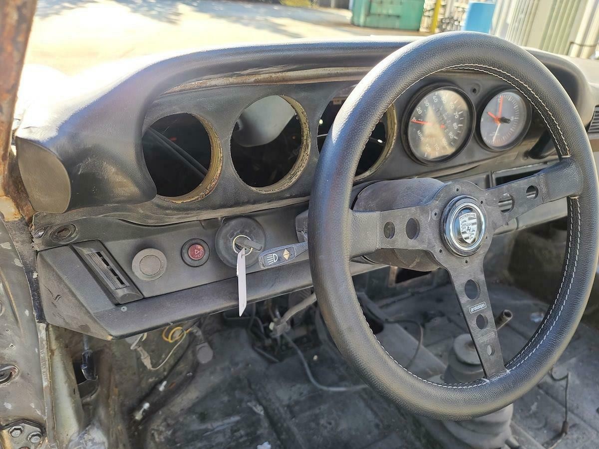 The car comes with an apparently rebuilt (it looks the part) three-liter Euro engine, a 915 transmission, RS clutch, and 964 brakes. The idea was to create an RSR or ST clone. All the metalwork has been done, but the photos indicate a fair amount of finishing and surface-rust removal is in order before the Mexico Blue pot can come out. And it’s filthy dirty, evidently from sitting around for a while.