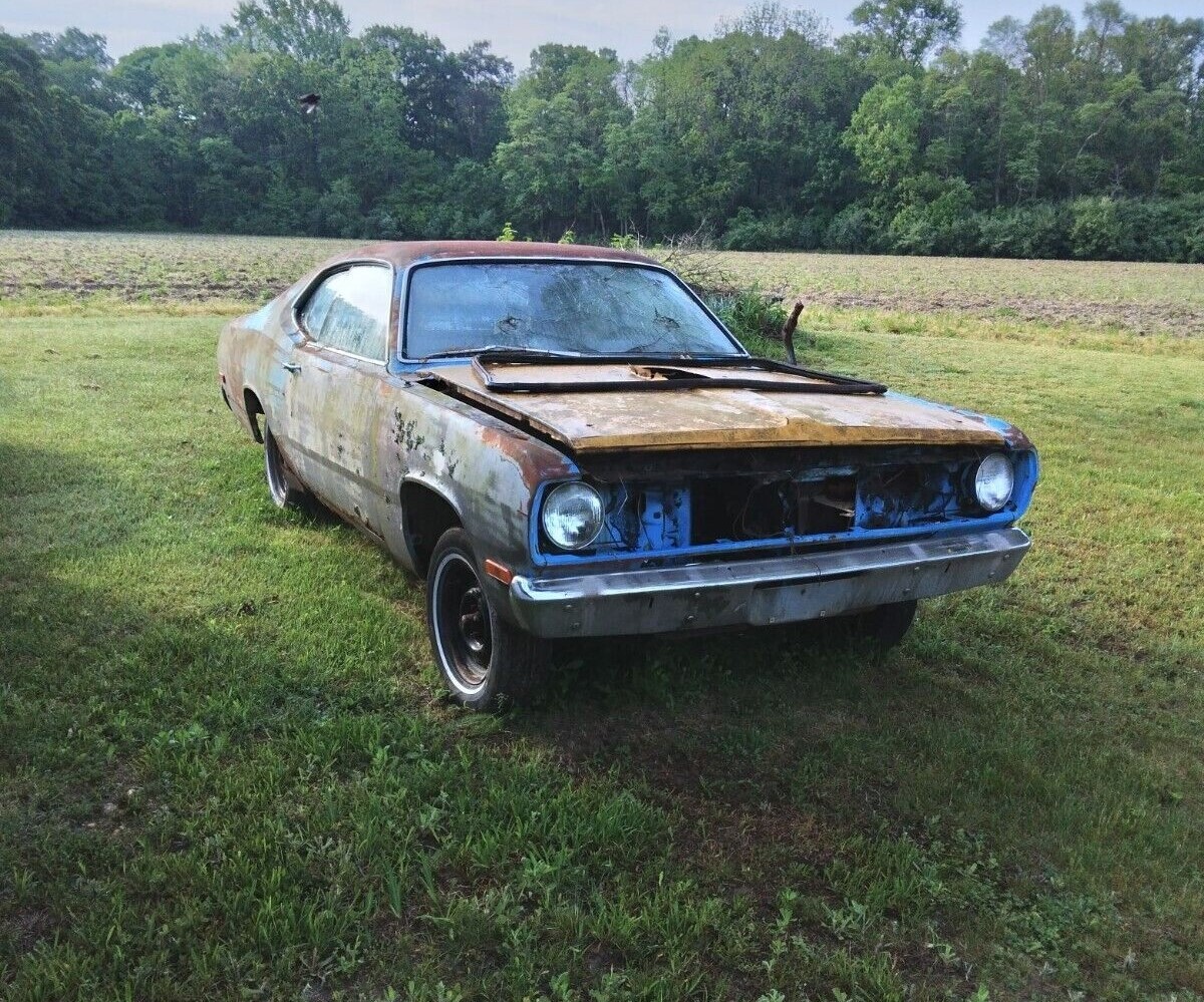 Definitely a 1972, the vin shows it and the taillights are 1972 only . I’d say it was someone’s parts car, and now somebody is trying to unload the picked over carcass . Unfortunately, its not the most desirable year, and what makes a Duster 340 a Duster 340 is no more. Its too far gone to be worth a restoration , If the rear diff is still original to the car (but I’d bet its been swapped out) , and if the V8 engine cradle is good , and the few pieces that are still useable – maybe ,MAYBE this could sell for a grand, but even that would be pushing it