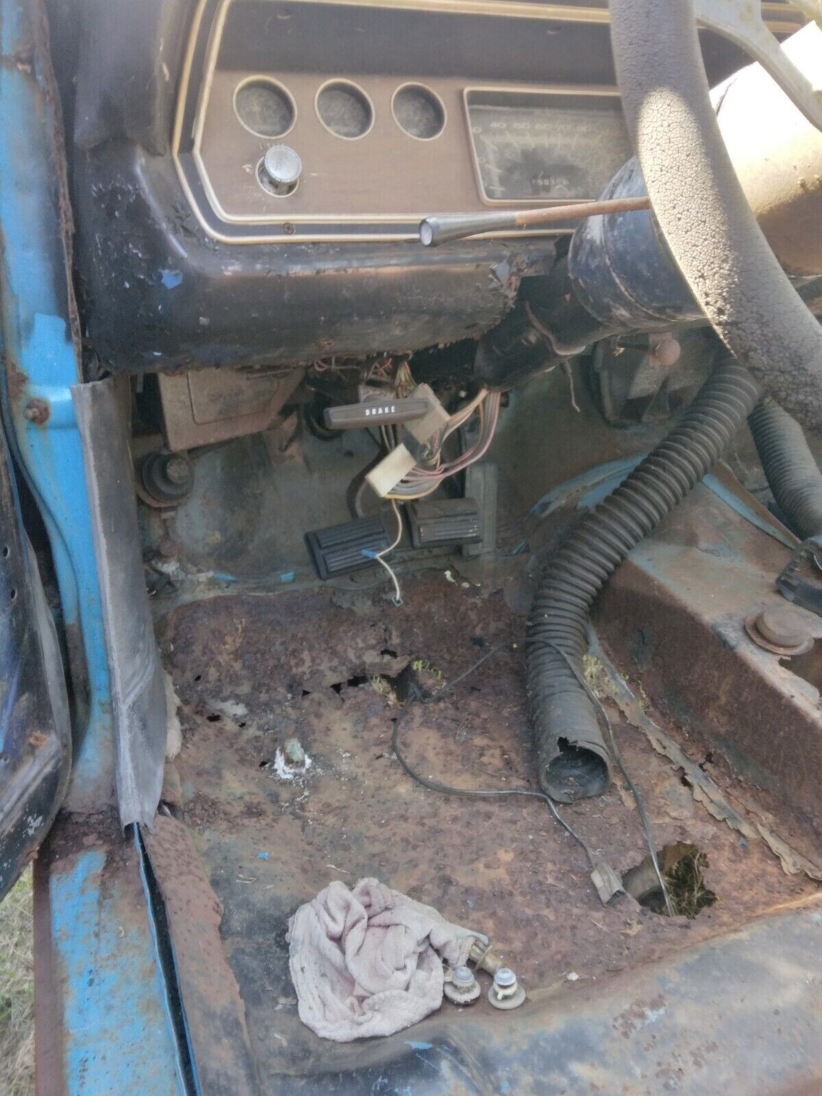 The seller seems a little confused as to whether this roller is a ’72 or ’73 model-year car, but we’re going with the former. It once wore Basin Street Blue paint, but evidence of that is minimal now except for the trunk and floors due to older red primer. The sheet metal is dinged and dented, and the grille is gone. From what we can tell, the floorboards at a minimum have rust, and getting the body back into shape will be an uphill climb.