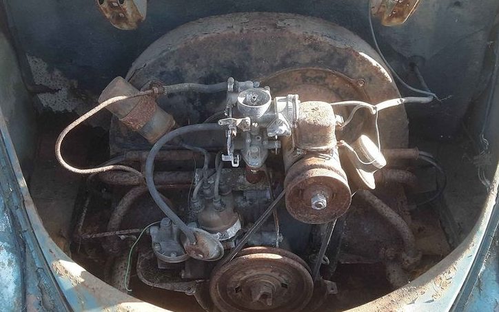 The seller’s description is curious, he states, “Classic, floor pans need replaced in their entirety, although there is no body rust, 100% rust free,… the driver’s door is rusted badly“. That’s a bit of a disconnect, either there is rust in the body or there isn’t, and last time I checked, the door is part of the body. Admittedly, the body looks pretty straight with quite a bit of surface or patina rust – but no obvious rot. The seller mentions that there is no rear bumper but makes no reference to the conspicuously missing hood – it is available however as the final image, below, reveals its existence. The front bumper, which is frequently mashed-in on old VW beetles is straight on this example, but it is very corroded. The glass, including that oh so valuable rear window, is all intact and none of the pieces appear to be cracked.