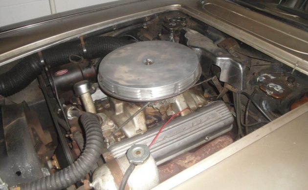Other than some odds and ends under the hood (a couple missing pieces of ignition shielding, rubber fuel line, air cleaner wingnut, radiator cap, throttle return spring, what looks like an alarm system on the left inner fender, etc) it appears to be a very original 62. I’m pretty sure the price will continue to climb past it’s current $40K.