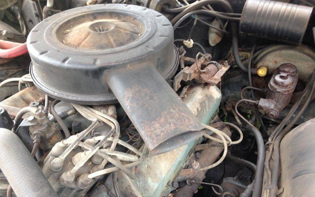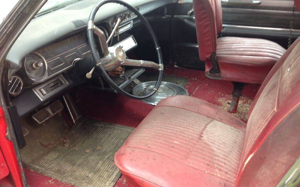 The interior has been modified with a driver’s bucket seat to accommodate the announcer’s perch. It’s actually in fair condition with a thorough cleaning being the first order of business. The instrument panel is sort of clear and complete and of note is the “Comfortron” automatic air conditioning/heater system. I had a ’66 Impala with that blasted system and it is monstrously complicated – it must have 200 feet of vacuum tubing, in six-foot lengths, running every which way. The parts are very hard to source anymore.