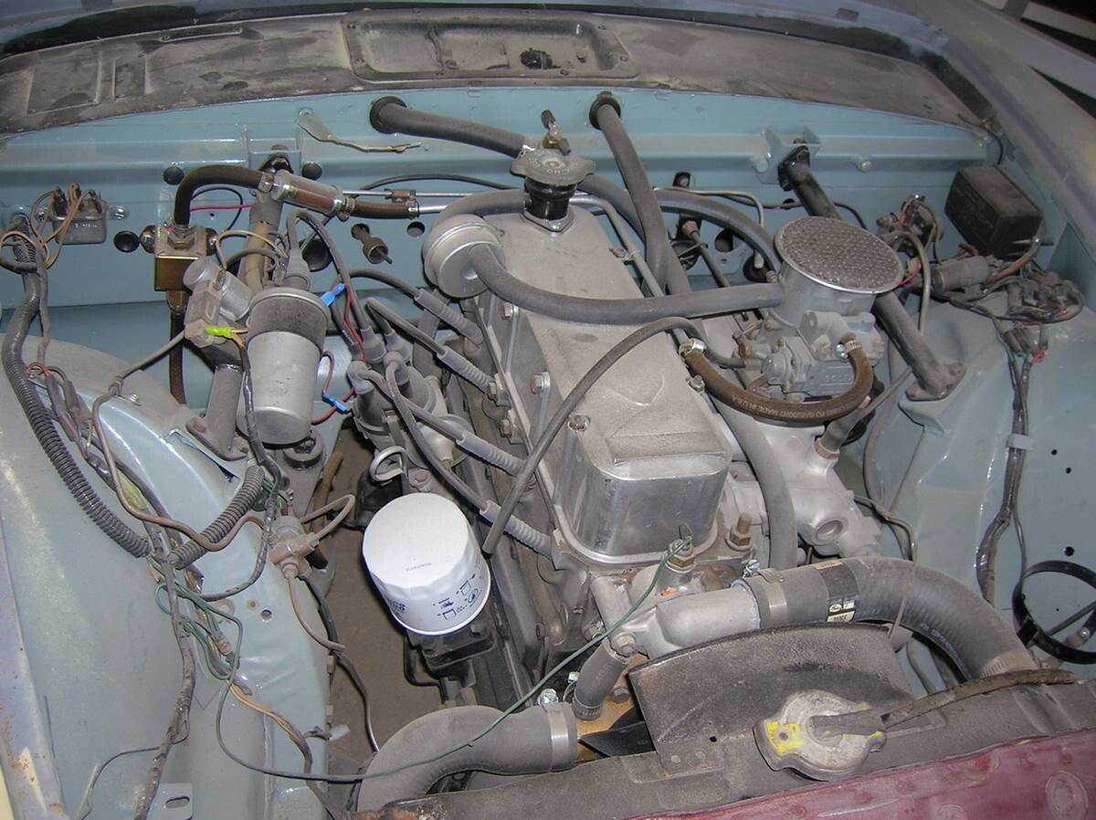 I had a good friend in high school who was into the Sunbeam Alpine, of all things. His dad liked Triumphs and had a thing for GT6s; the Alpine seemed like an attainable project car that allowed him to go to car shows with his pop. I was never overwhelmed by it; yes, it was slow, but that wasn’t the issue. It just didn’t seem to handle all that well, and that’s generally the trade-off I see with a slow sports car. It may be slow, but nothing will catch it in the corners. I suppose his car wasn’t set up to do anything other than cruise, owing to the typical high schooler’s budget. The engine bay is quite dusty, suggesting a few years of inactivity.