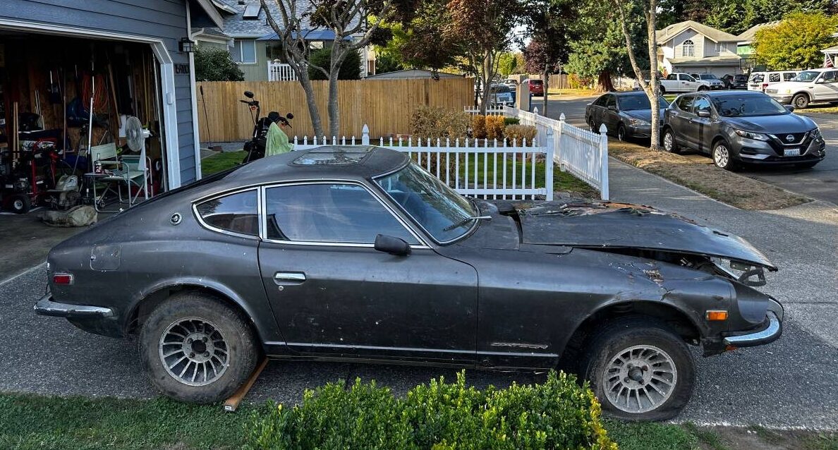 If both of these cars enter a garage, only one will come out alive. The black one appears to have survival potential. Without a doubt, there is more than $3,500 worth of parts if parted out. I hate to see a 240Z succumb to the crusher. Someone will offer 80% of what his is asking.