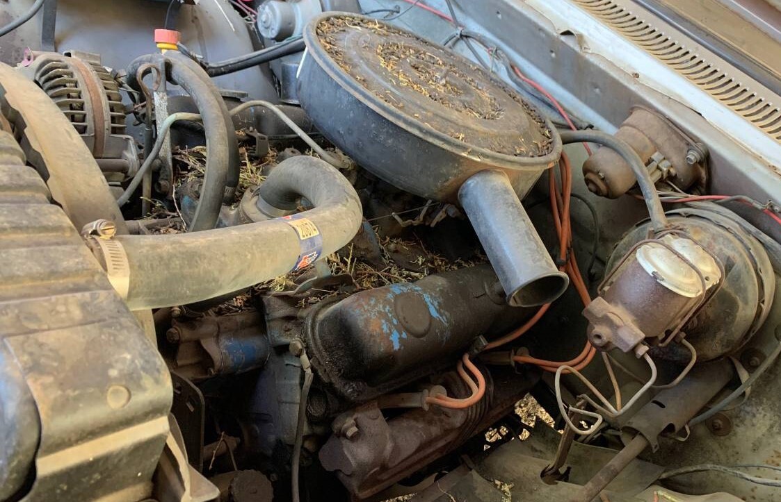 The 318 cubic inch V8 does not run and there’s no indication of what it would take to change that shy of a full servicing of the fuel-delivery system. It has a floor-shifted manual transmission which could be either a 3 or 4-speed. To help with road trips, the Dodge has dual fuel tanks, which means both of them will need to be cleaned out. There is evidence some woodland creatures set up shop under the hood, so be wary of wiring damage, too.