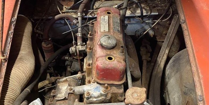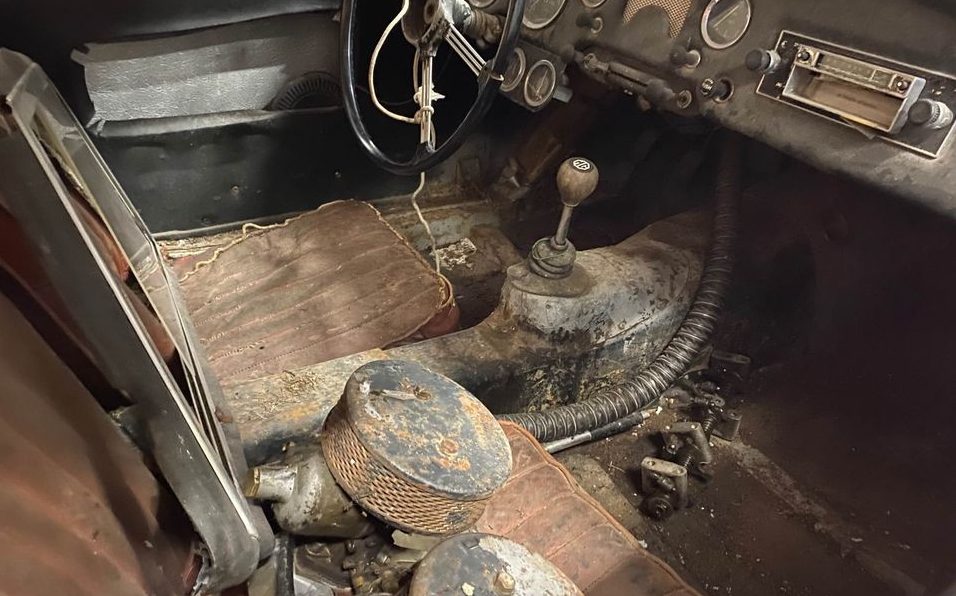 The 72 HP, 1500 CC, in-line four-cylinder engine is claimed to be original but it’s minus a bunch of parts though the intake manifold and carburetors are hanging out in the passenger seat. The radiator is disconnected and there are open valve cover ports, probably for breathers. It has probably been many years since this MGA last went on a road trip. The sole transmission selection for this year MGA was a four-speed manual transmission.