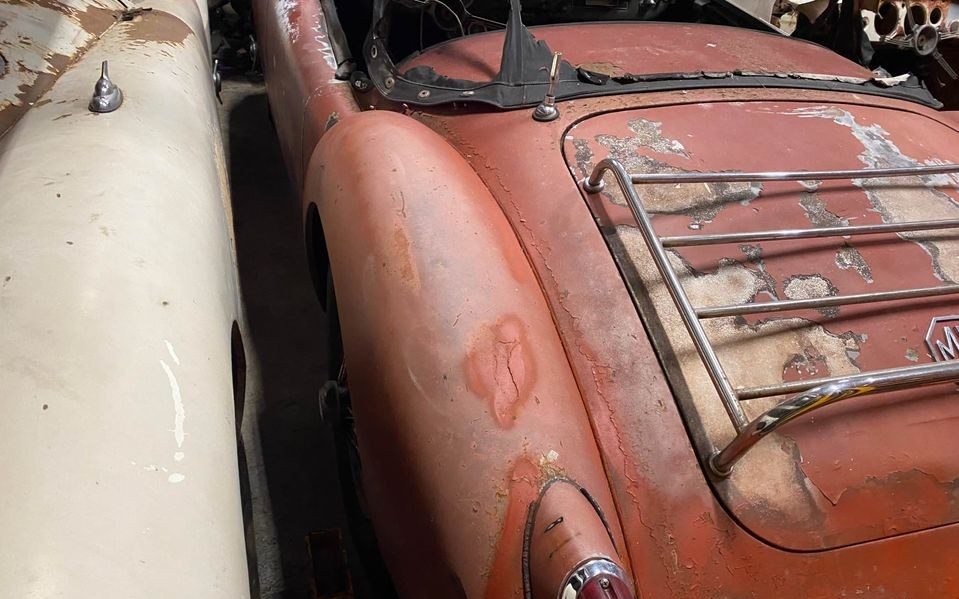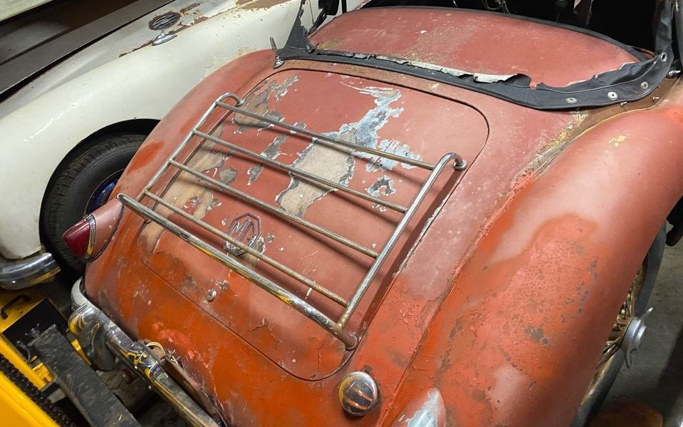 The listing states, “Complete project car comes with original 1500 engine. Not running. Needs full restoration. Wire wheels. Titled” and that’s it, the pictures will have to do the talking. And the pictures aren’t saying much as this MGA is packed in tightly and there’s no way to get a complete look at it. Some of the finish appears to have been applied with a rattle can and the top is fairly well shredded. The brightwork is pretty dull but most of it, save an MGA grille on the driver’s side fender, is intact. There is some surface rust evident but there is no indication of rust through or body panel damage – but then again, the viewing is very limited.