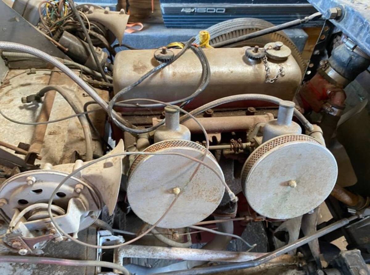 The TC, predecessor to the TD, was credited with sparking the sports car craze in America, as a few were exported from Britain to the US and several were brought home by servicemen. But the TC was never a left-hand drive car and its dimensions, gearing, and suspension didn’t cut it on our long highways. The TD’s longer-legged axle ratio and improved suspension seriously boosted sales and gave MG a genuine foothold in the US market, where we had never seen anything so lithe and rakish. This package deal contains one in-line four-cylinder motor mated to a gearbox. The original engine was just 1250 cc’s but the cars felt spunky despite the small displacement. No word in the listing regarding the current condition of this engine/transmission, or even if they are original to the car; engine swaps are common.