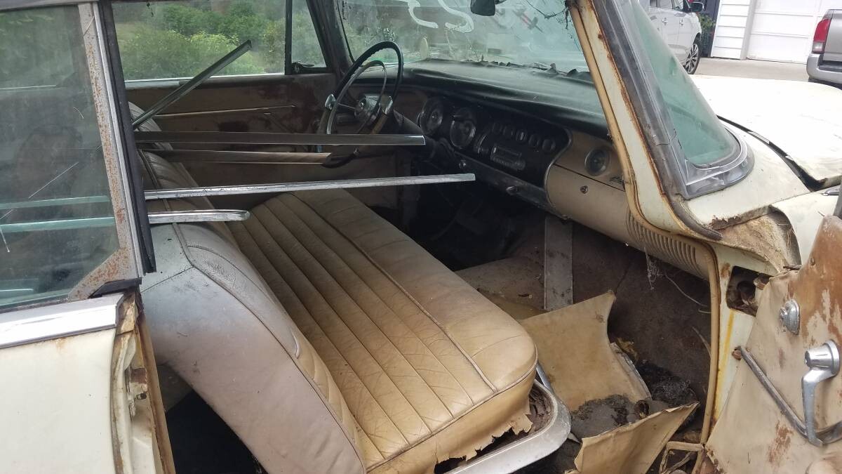 These were elegant, real estate-consuming cars, especially as 2-door hardtops. Only 2,094 of that body style were built in 1956, so they weren’t a common sight then and certainly not now. This is a complete car that’s been living in the barn for many moons. The body looks mostly straight, though the white paint is beyond making a comeback. There’s a dent in the passenger side door, but it doesn’t look serious, and there’s a bit of rust here and there. The 354 cubic inch Hemi V8 engine is still intact. This auto could be restored but it’s going to take a sizeable bank account to pull it off.