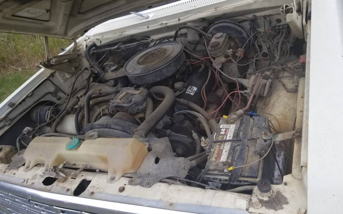 The western theme continues on the interior with the “western motif” seat fabric and that was about it inside. The thick carpet was pretty luxurious for a pickup and the interior looks like it needs a bit of freshening up. I wonder why the driver’s-side window crank is taped? This truck has cruise control, tilt steering, and AC.