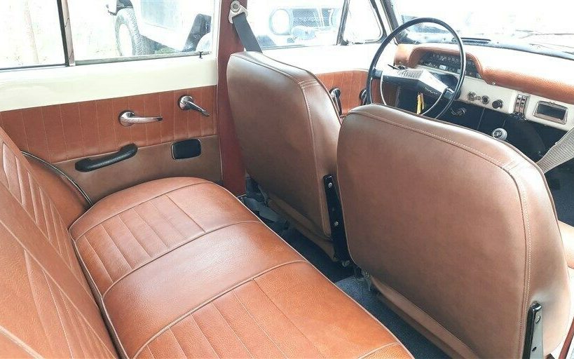 Inside really shows with saddle-tan vinyl seats, both front and back seat. The Wilson basketball-themed material (faux lizard according to the seller) even extends to the dash pad. The gray carpet, including that covering the cargo-carrying floor, looks like a recent replacement. Of note are the shoulder harnesses, original for ’66? If so, that would be in keeping with Volvo’s safety theme focus.