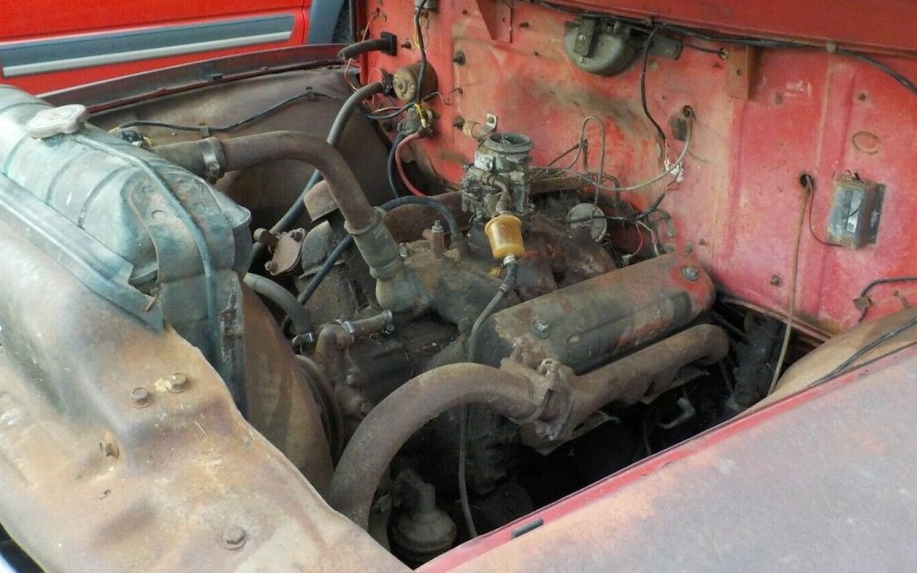 The engine is a 272 cubic inch V8 backed by the previously mentioned 3-speed tranny. The seller describes themselves as “not mechanical” and they say the engine is in unknown condition. It looks like the fuel filter and carburetor are fairly clean, so perhaps the previous owner had it running at one point? The ad also mentions the brakes are not operational.