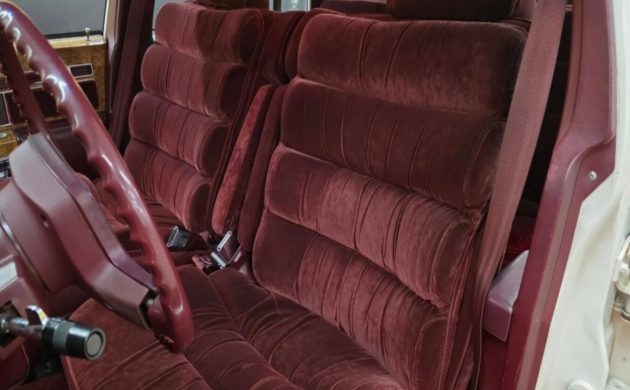 I wish I’d bought futures in maroon velour fabric back in the early eighties; I would have made a killing considering how much of that stuff GM, alone, used across its five brands. And that’s the case here, in full pillow-top regalia. I gotta admit, it looks comfy, almost too much so; I’m afraid one might fall asleep while cruising America’s highways and byways at the 1984 double nickel posted speed limit. Anyway, the entire environment’s condition mirrors that of the exterior; it’s like new with nary a hair out of place. The faux wood is a bit overdone, but that was a mark of the times. The listing mentions that the A/C system has been converted to 134A refrigerant and the system is fully functional.