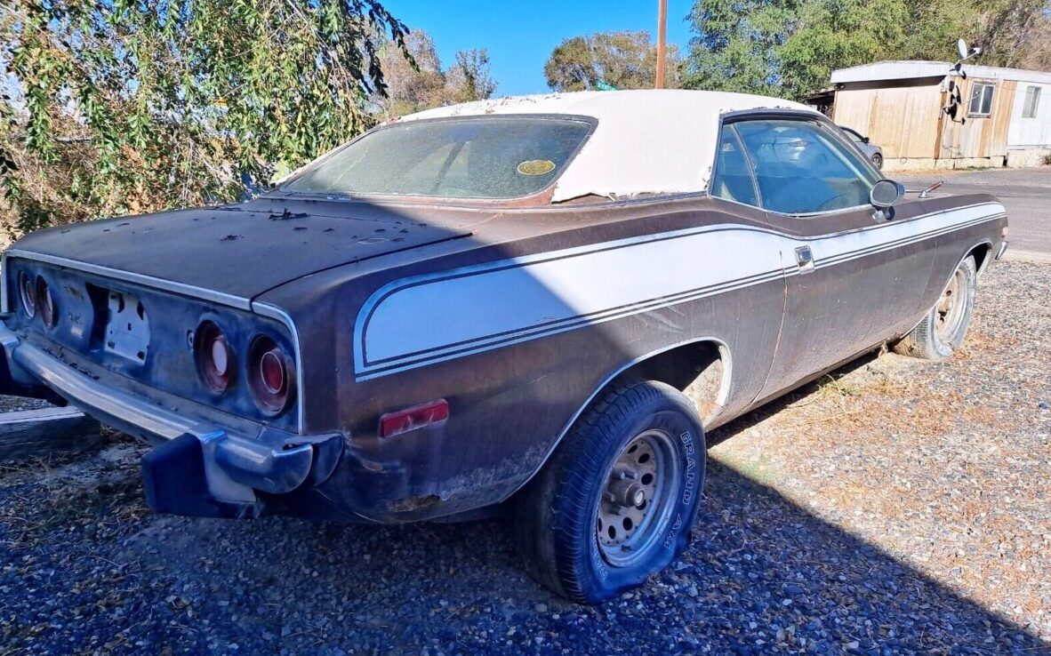 The seller describes the roof as “very solid,” though disintegration at the base of the C-pillar may require some repair. The V1W Full Vinyl Top in White is probably a tattered original and V6W Longitudinal Stripes in white could be original as well. The “BS23” VIN makes this a ‘Cuda model, the sportier variant of the BH23 Barracuda. While this desert castaway could become anything under the sun with Hellcat power or a classic 440, I’d like to see it put back to original, and I hardly ever say that! Do you picture this long-parked Plymouth becoming a fire-breathing resto-monster or restored to original with the modest 318?