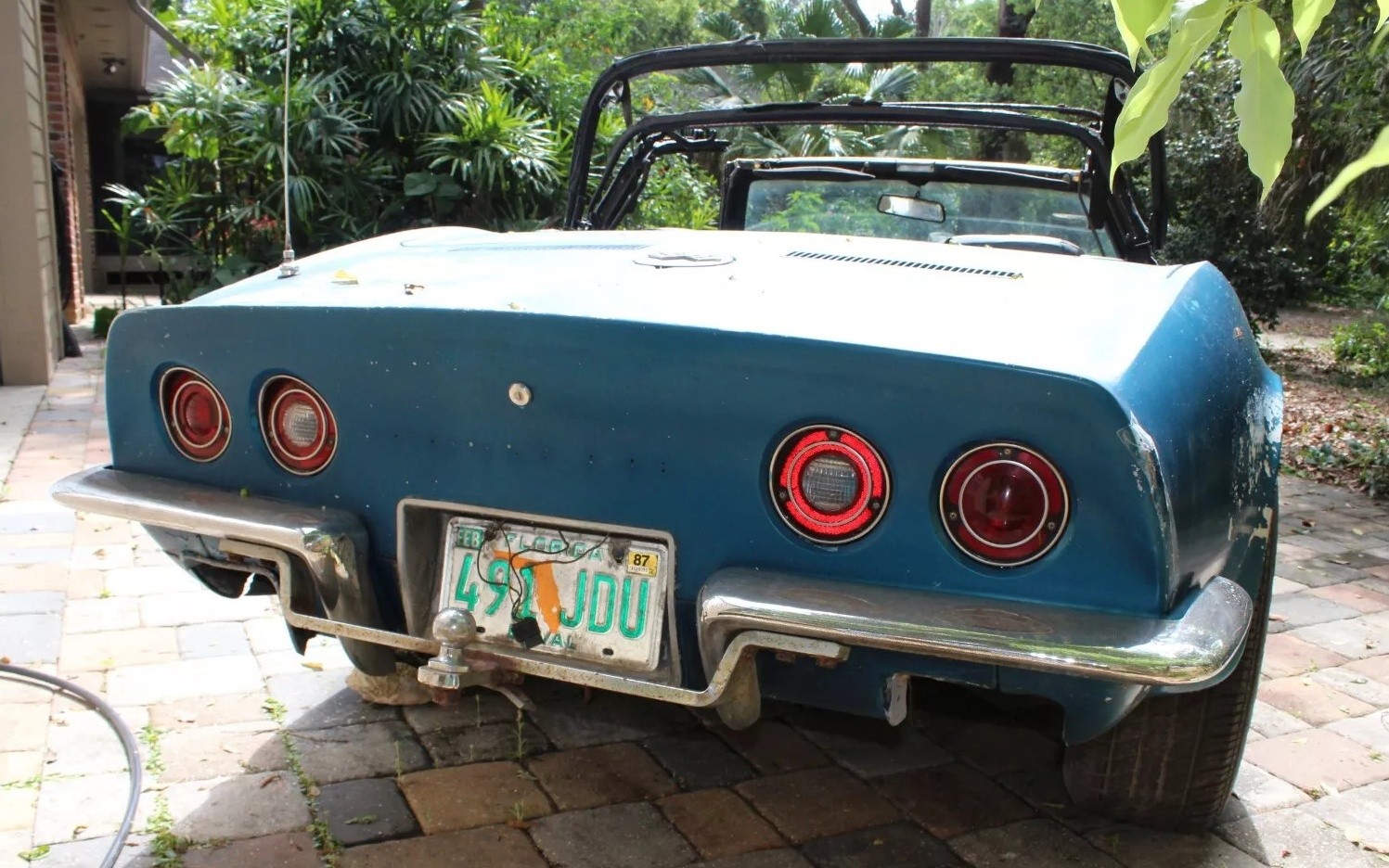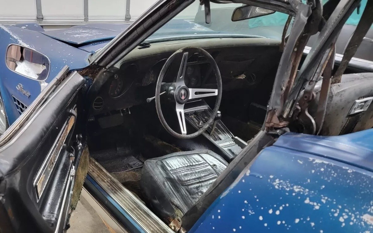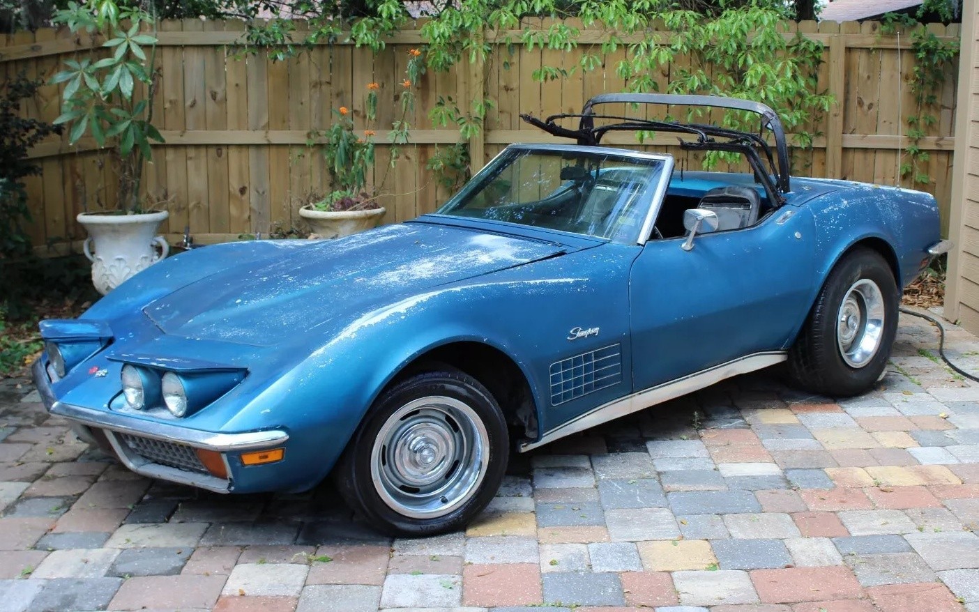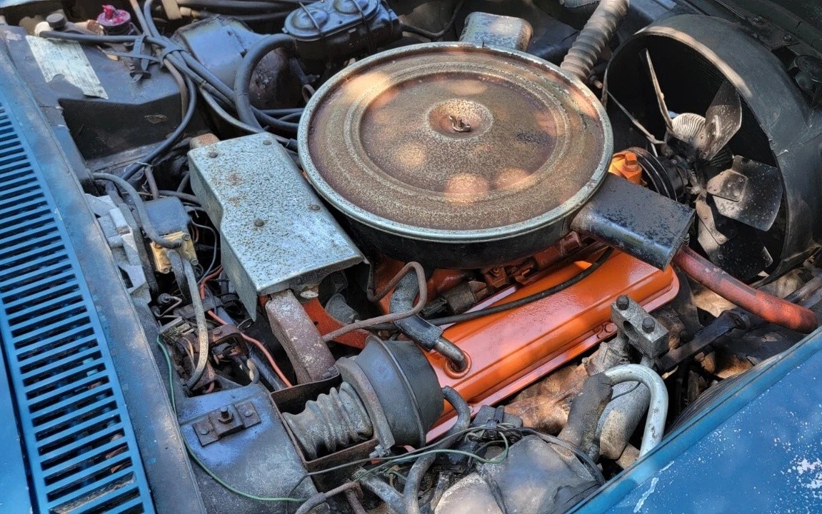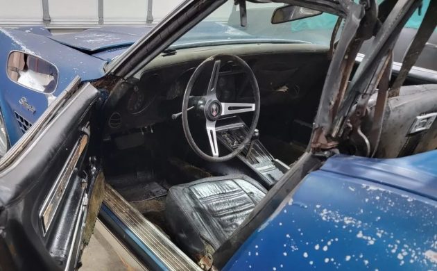Of the 27,004 Corvettes built for the ‘72 model year, 20,496 were coupes versus 6,508 convertibles, so the rag top is the rarer of the two. It’s a good thing this car’s spent some time inside, as the roof canvas is non-existent, and I’m not sure whether or not those roof rails will be salvageable. With the amount of patina present, this one’s also been outside a lot before the last thirty years, and there’s a crack in the fiberglass noted behind the rear tire on the driver’s side. It’ll take some panel prep before the body is ready for a fresh coat of Bryar Blue, but I’ve seen far worse starting points outside for C3s.