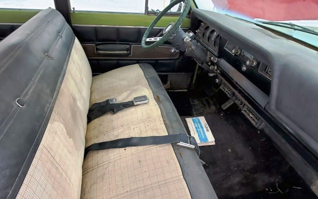 The power rear window either works or got stuck part-way open. Safety Green may not be everyone’s favorite but it definitely makes a statement. Few purists would suggest preserving the checked white side panels. Trailer towing would be just another day in of the life of a Wagoneer.