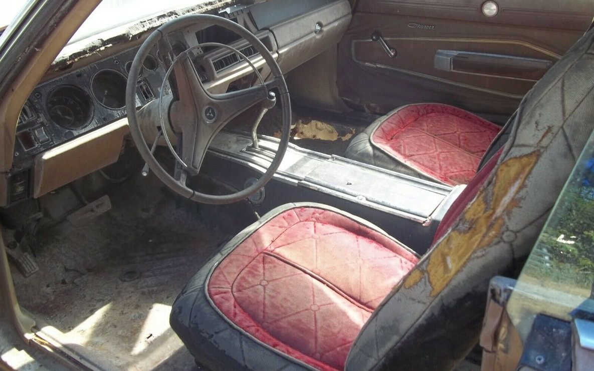 The seller describes this barn find Charger as follows, “The car is mostly complete, solid frame rails will need patchwork or replacement of the interior floor pans and trunk pan”. He further adds, “Fenders, doors, trunk lid hood may be useable or repairable”. The finish is listed as FT6 with a tan top and Saddle Tan interior. The body is pretty banged up with rust, dents and there is something going on around the rear window. And that tan top is absent revealing the leaded C-pillar seams and lots of surface rust. While Mopars of this era are very desirable cars, the bodies didn’t hold up worth a darn. Winter driving and time spent in wet climates did them in, quickly. Some of the trim is missing, along with the backup lights, and the grille, which is in reasonable shape, is missing some of its centerpieces. Reproductions are available, but they’re expensive. The bumper chrome is a bit weak too, not to mention claims of straight alignment. The slotted aluminum wheels and cheap wide, white letter tires are a nod to the ’70s.